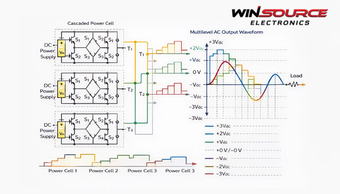 Each power cell handles only a fraction of the total output voltage. This allows the use of lower-voltage semiconductor devices, improving reliability and reducing device stress.